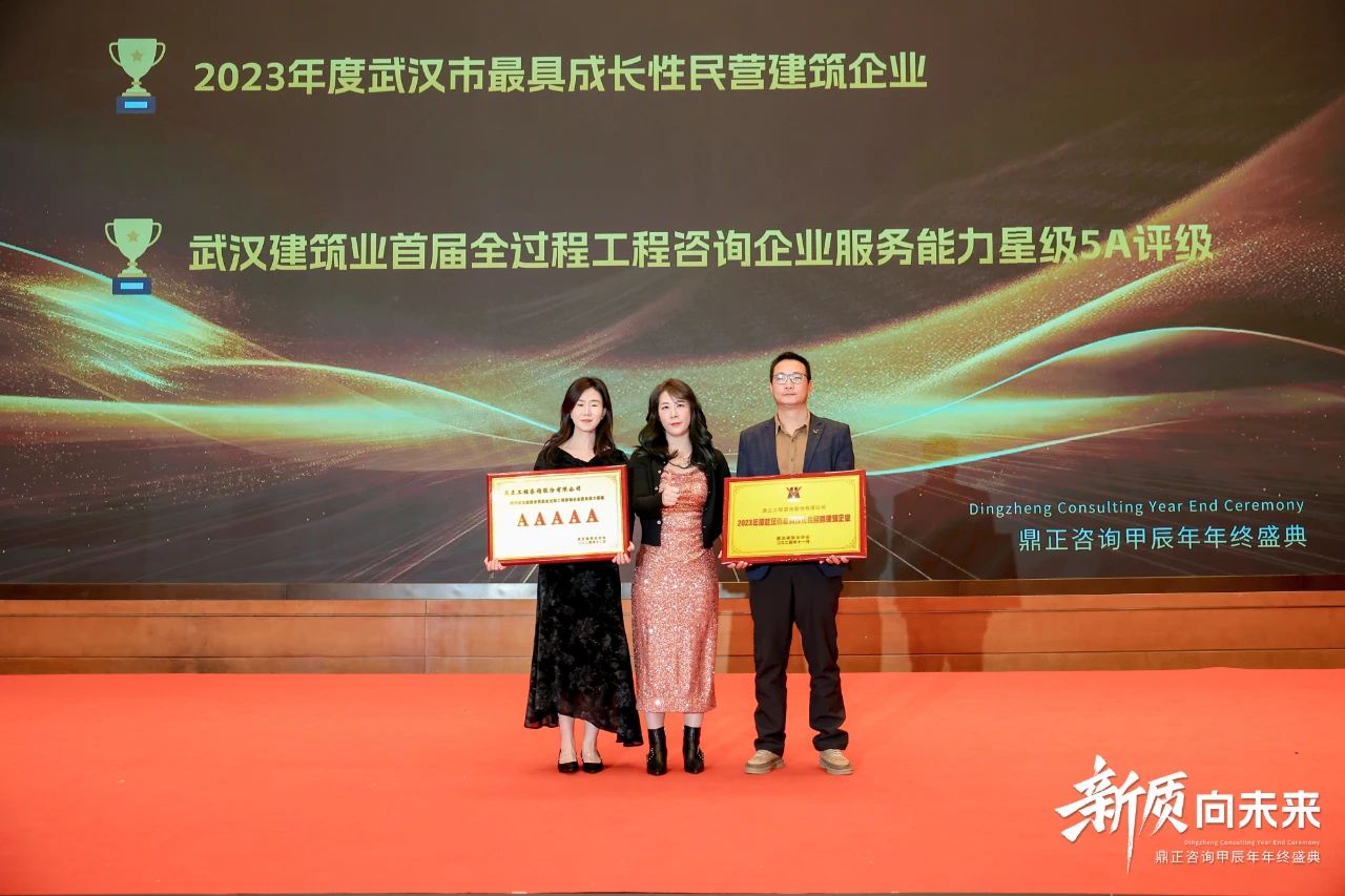 在過(guò)去的一年里,鼎正在專家輔助人、專項(xiàng)債、超長(zhǎng)期特別國(guó)債、中央預(yù)算內(nèi)資金、全過(guò)程工程咨詢等業(yè)務(wù)板塊中,展現(xiàn)出強(qiáng)勁的創(chuàng)新力,并獲得行業(yè)廣泛的認(rèn)可。當(dāng)晚,武漢建筑業(yè)協(xié)會(huì)領(lǐng)導(dǎo)代表、全咨分會(huì)秘書長(zhǎng)陳金琳女士,為我們頒發(fā)了2023年度武漢市最具成長(zhǎng)性民營(yíng)建筑企業(yè)、武漢建筑業(yè)首屆全過(guò)程工程咨詢企業(yè)服務(wù)能力星級(jí)5A評(píng)級(jí)兩項(xiàng)榮譽(yù)。