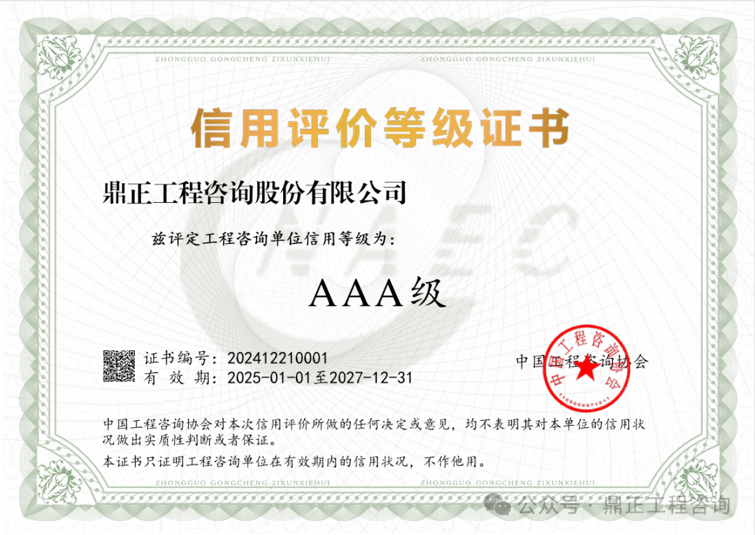 近日,中國工程咨詢協會發(fā)布了2024年度工程咨詢單位信用評價公告,鼎正憑借優(yōu)異的誠信建設和信用管理能力,榮獲“AAA級信用等級”評價。