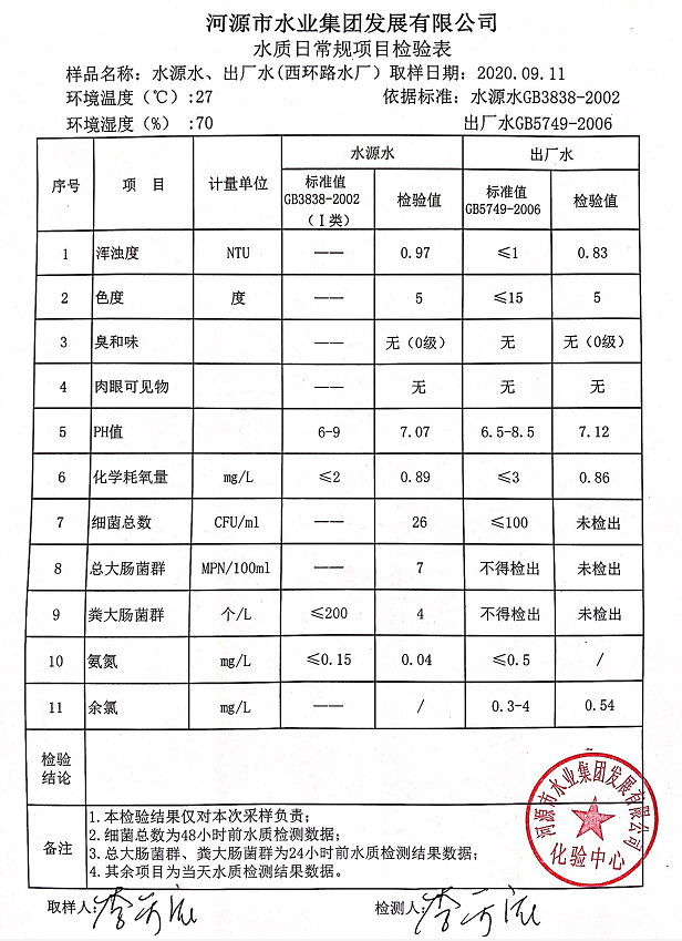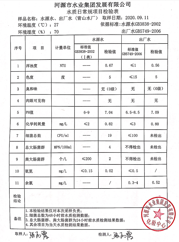 2020年9月11日水質(zhì)檢驗報告