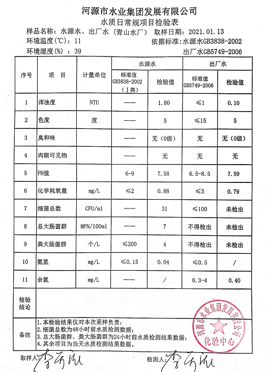 2021年1月13日水質(zhì)檢驗報告