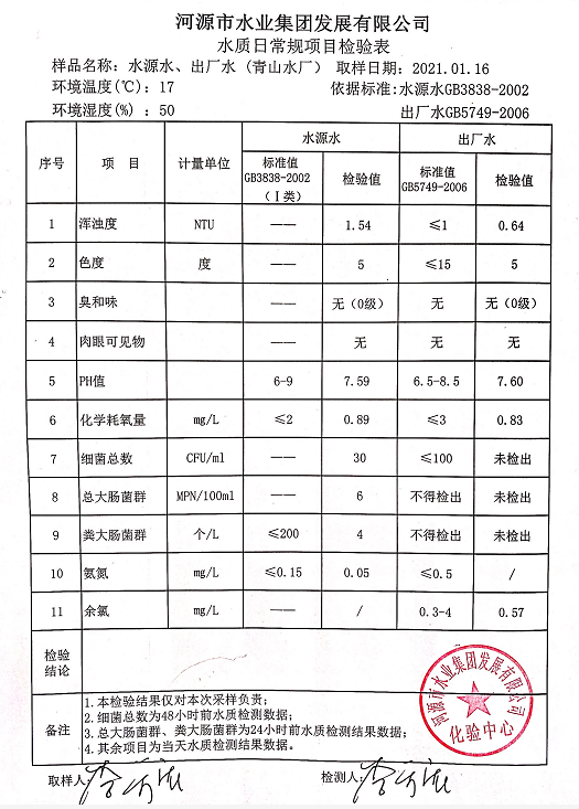 2021年1月16日水質(zhì)檢驗(yàn)報(bào)告