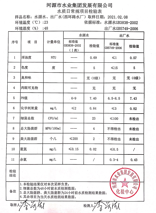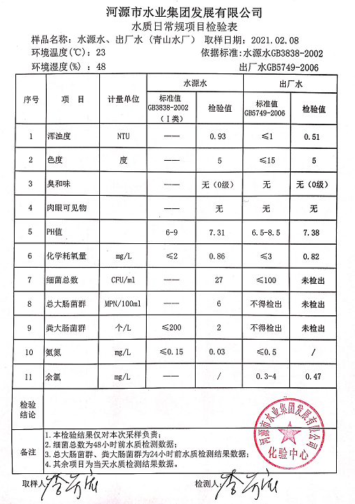 2021年2月8日水質檢驗報告