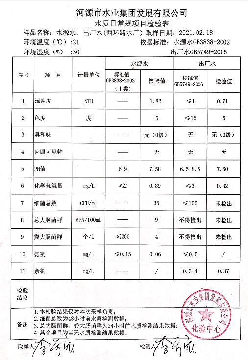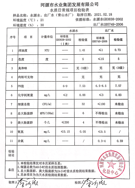 2021年2月18日水質(zhì)檢驗報告