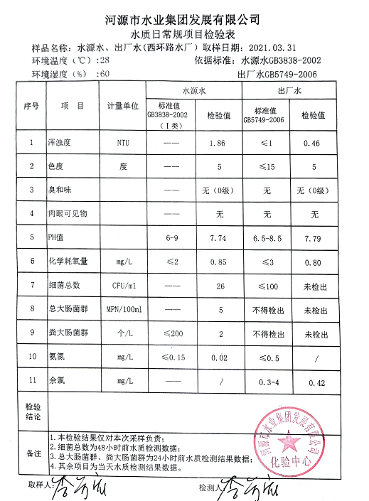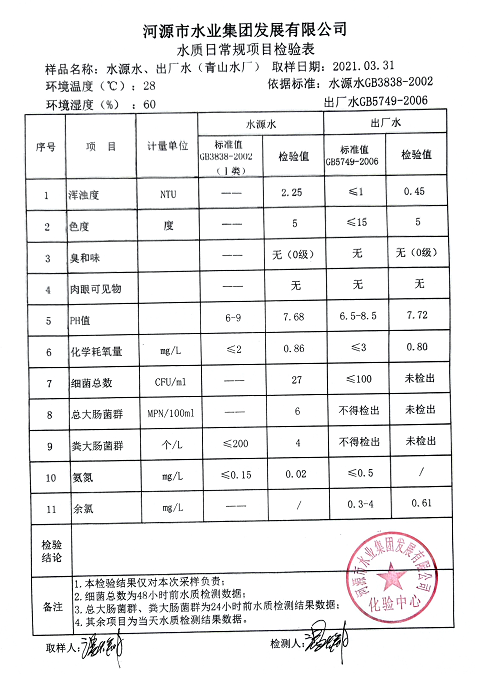 2021年3月31日水質(zhì)檢驗報告