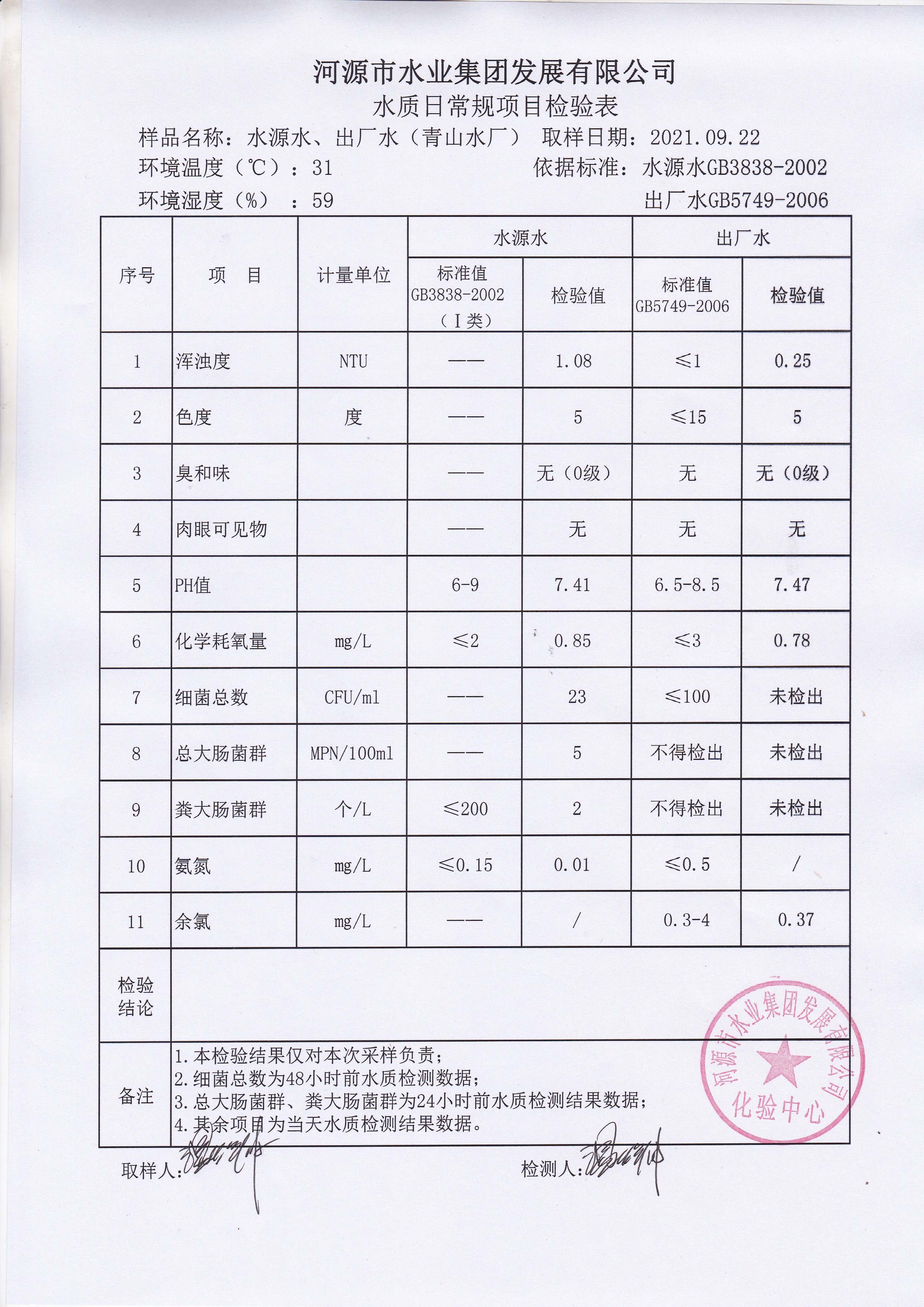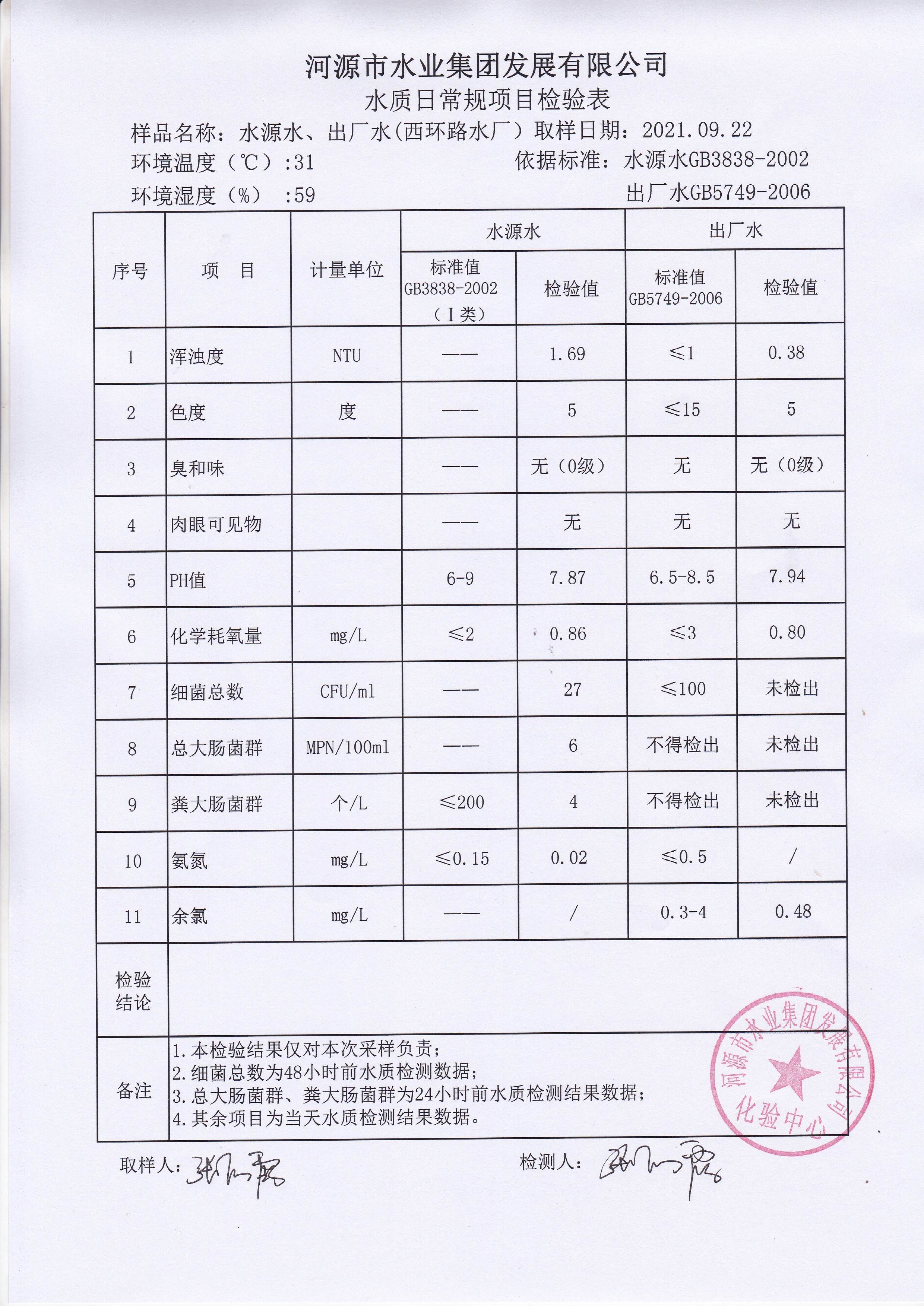 2021年9月22日水質(zhì)檢驗(yàn)報(bào)告
