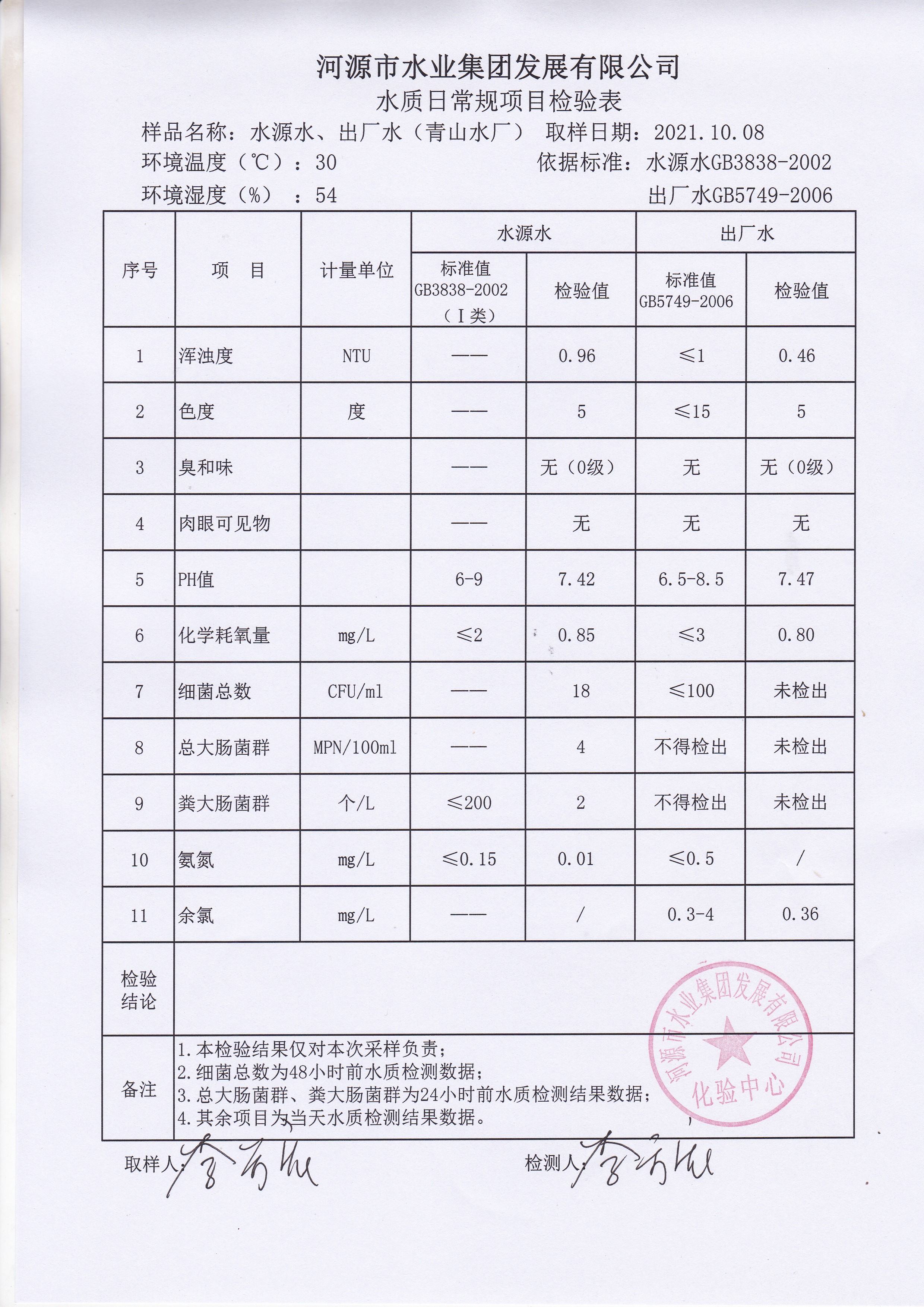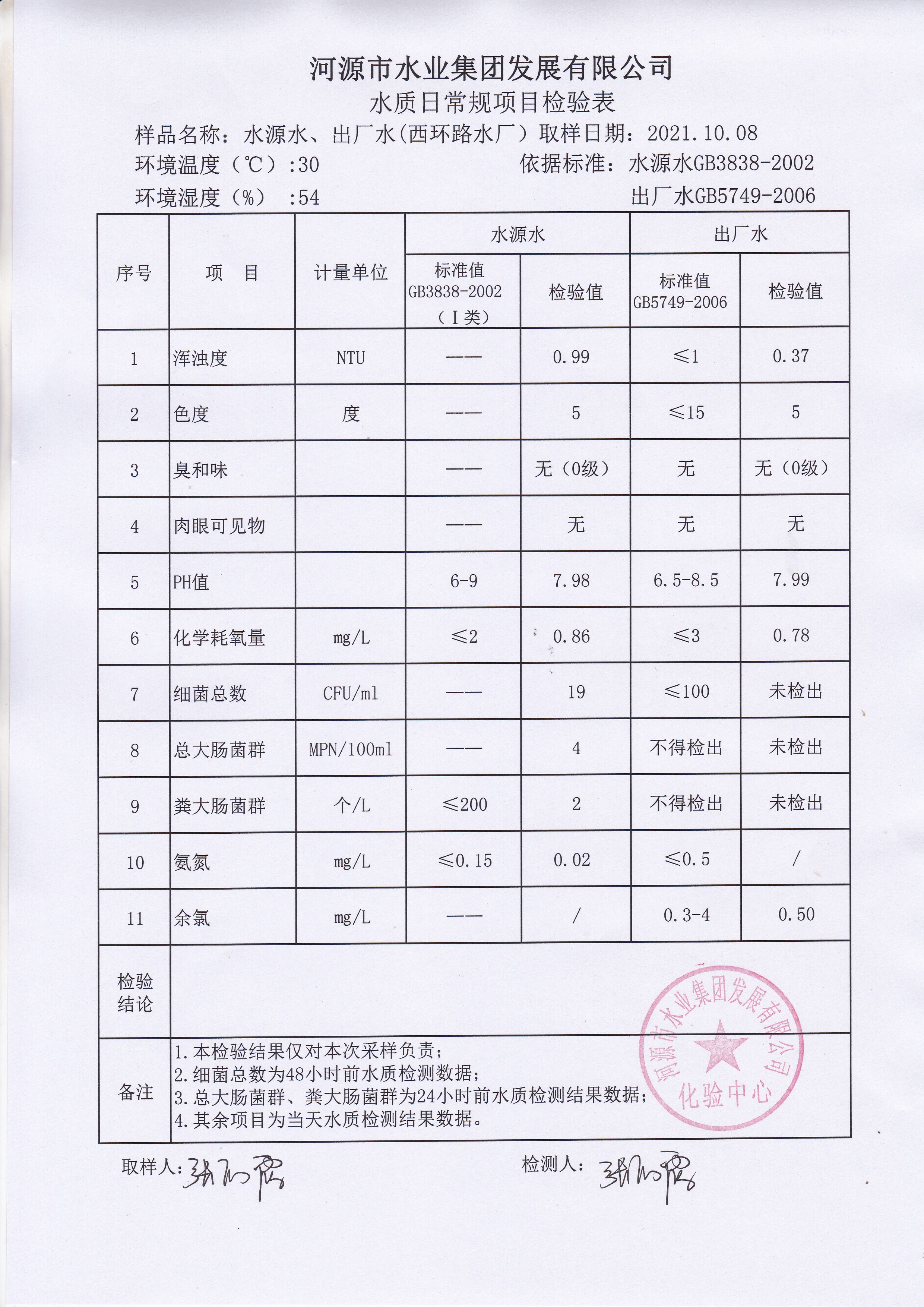 2021年10月8日水質(zhì)檢驗(yàn)報(bào)告