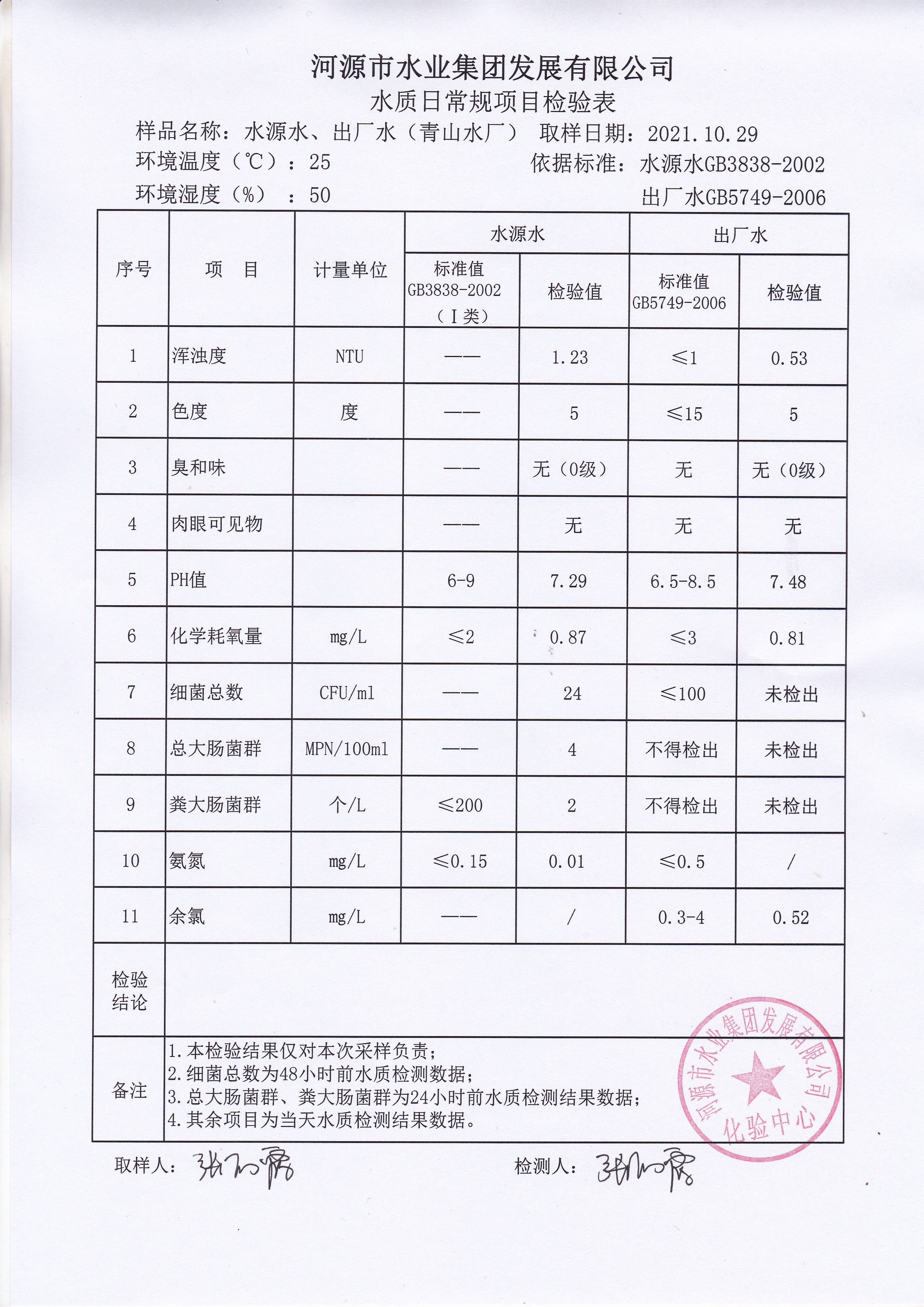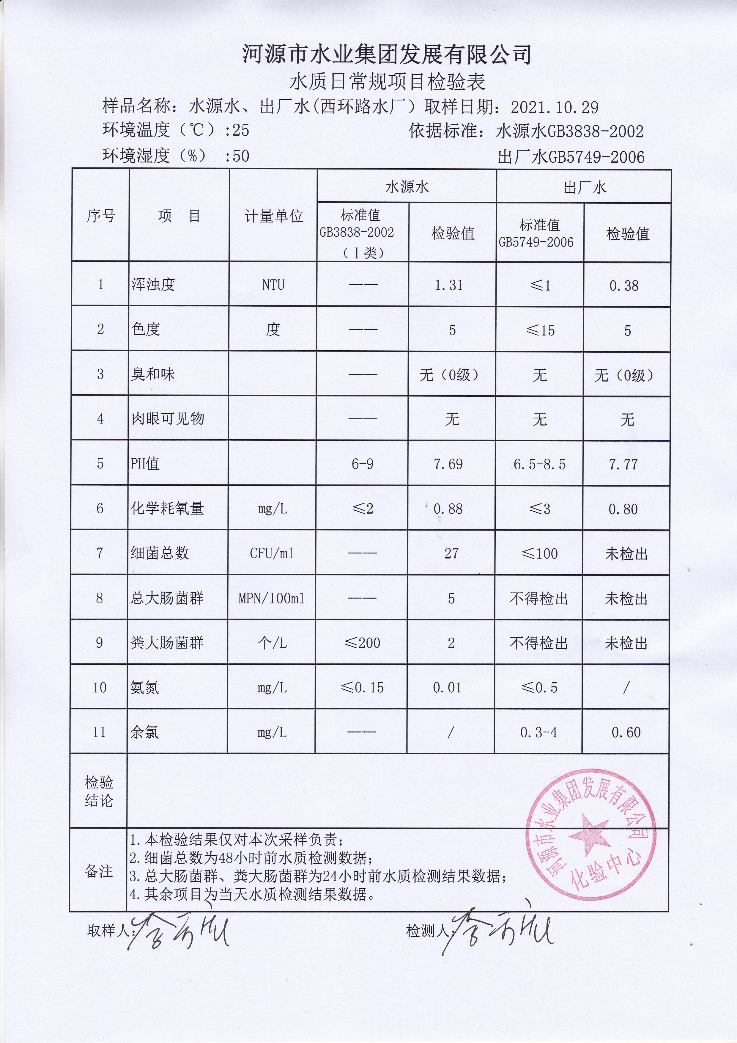 2021年10月29日水質(zhì)檢驗(yàn)報(bào)告