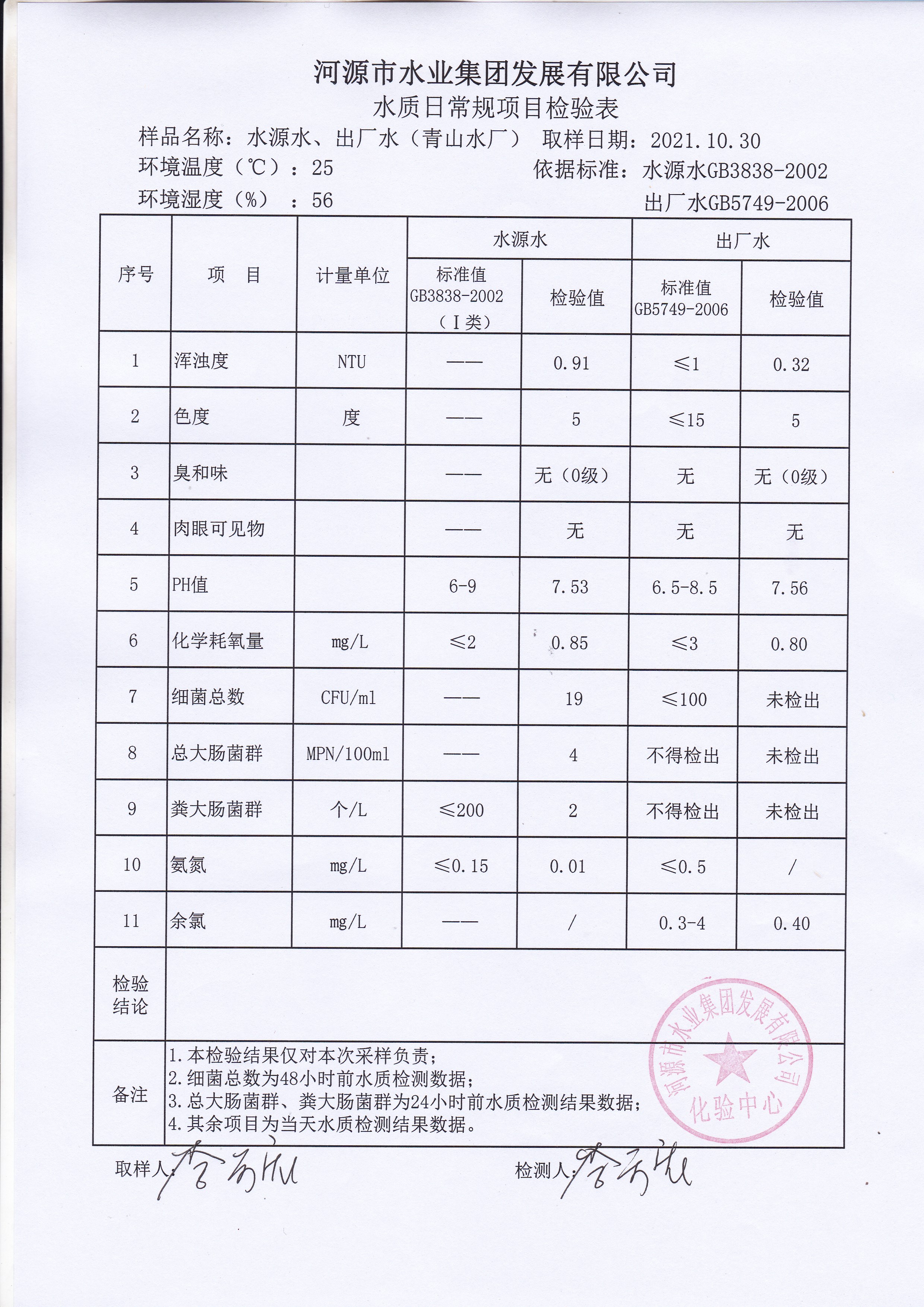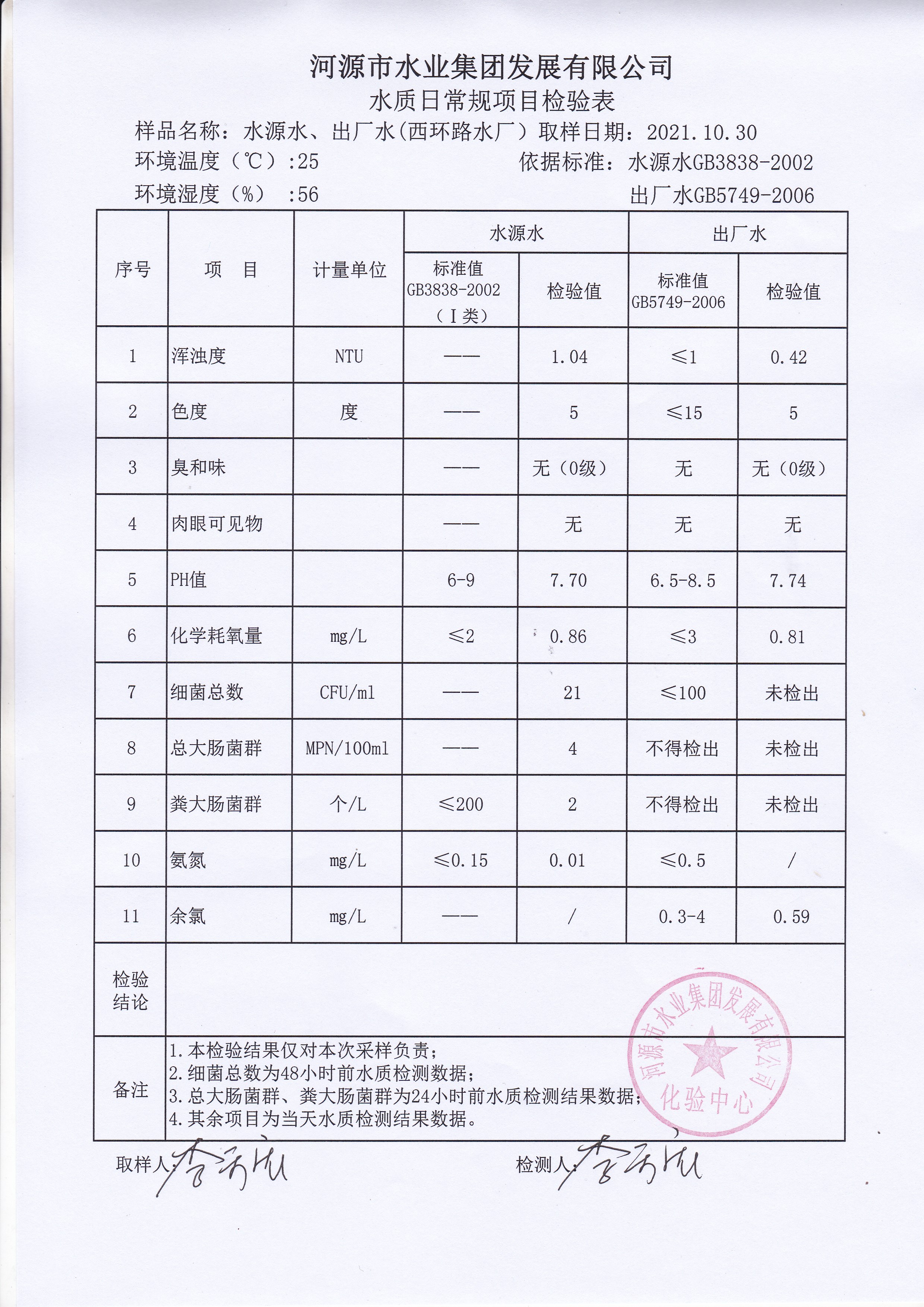 2021年10月30日水質(zhì)檢驗(yàn)報(bào)告