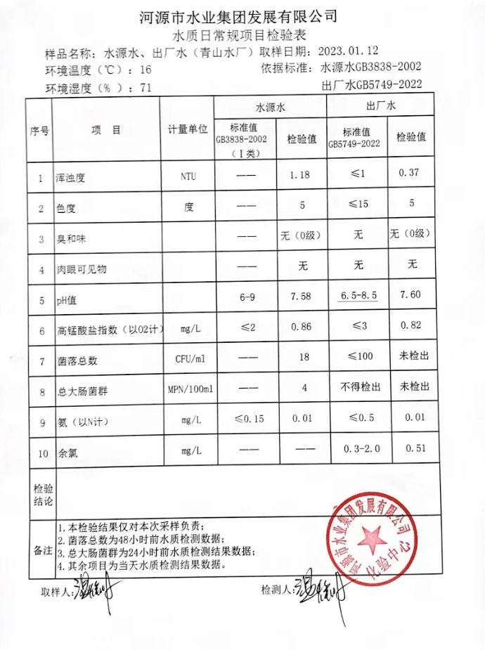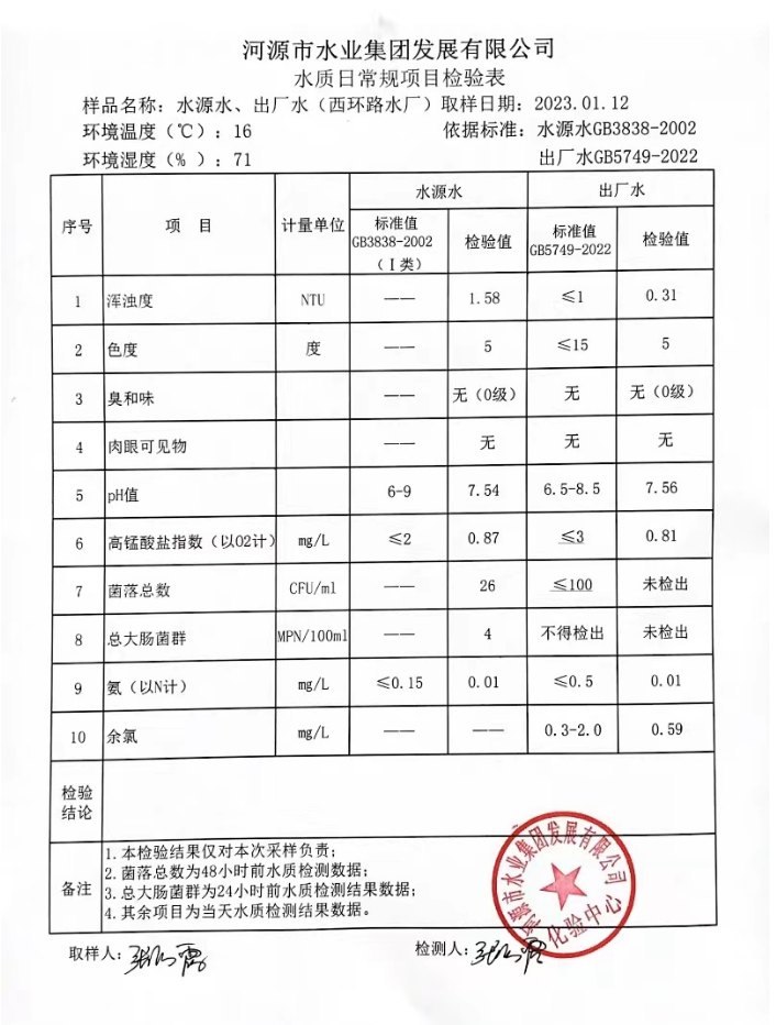 2023年1月12日水質(zhì)檢驗(yàn)報(bào)告
