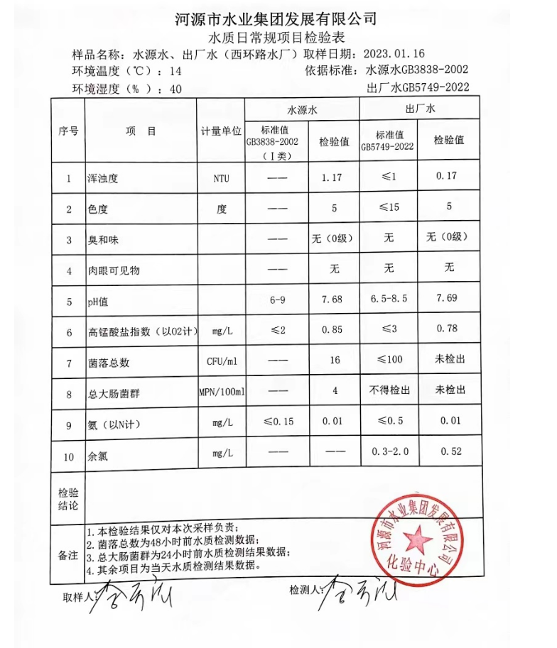 2023年1月16日水質(zhì)檢驗(yàn)報告