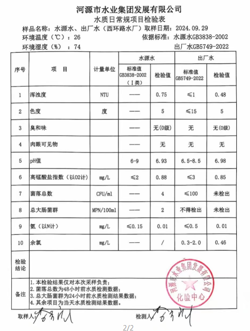 2024年9月29日水質(zhì)檢驗(yàn)報(bào)告